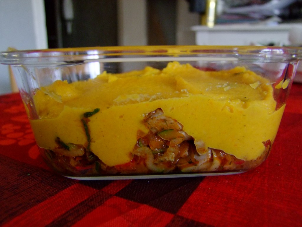 J’ai trouvé que cette purée hyper gourmande était un trop juste pour mes 2 colocs et moi. J’ai eu alors l’idée de préparer en parallèle des restes de poulet rôti + quelques légumes (oignons et ail émincés, poivron en brunoise, carotte et courgette râpées), de la purée de tomate et des épices, un hachis. Puis, j’ai monté hachis et purée en parmentier. Ça a fait la blague, nous nous sommes régalés avec la moitié et j’ai congelé le reste pour une autre fois